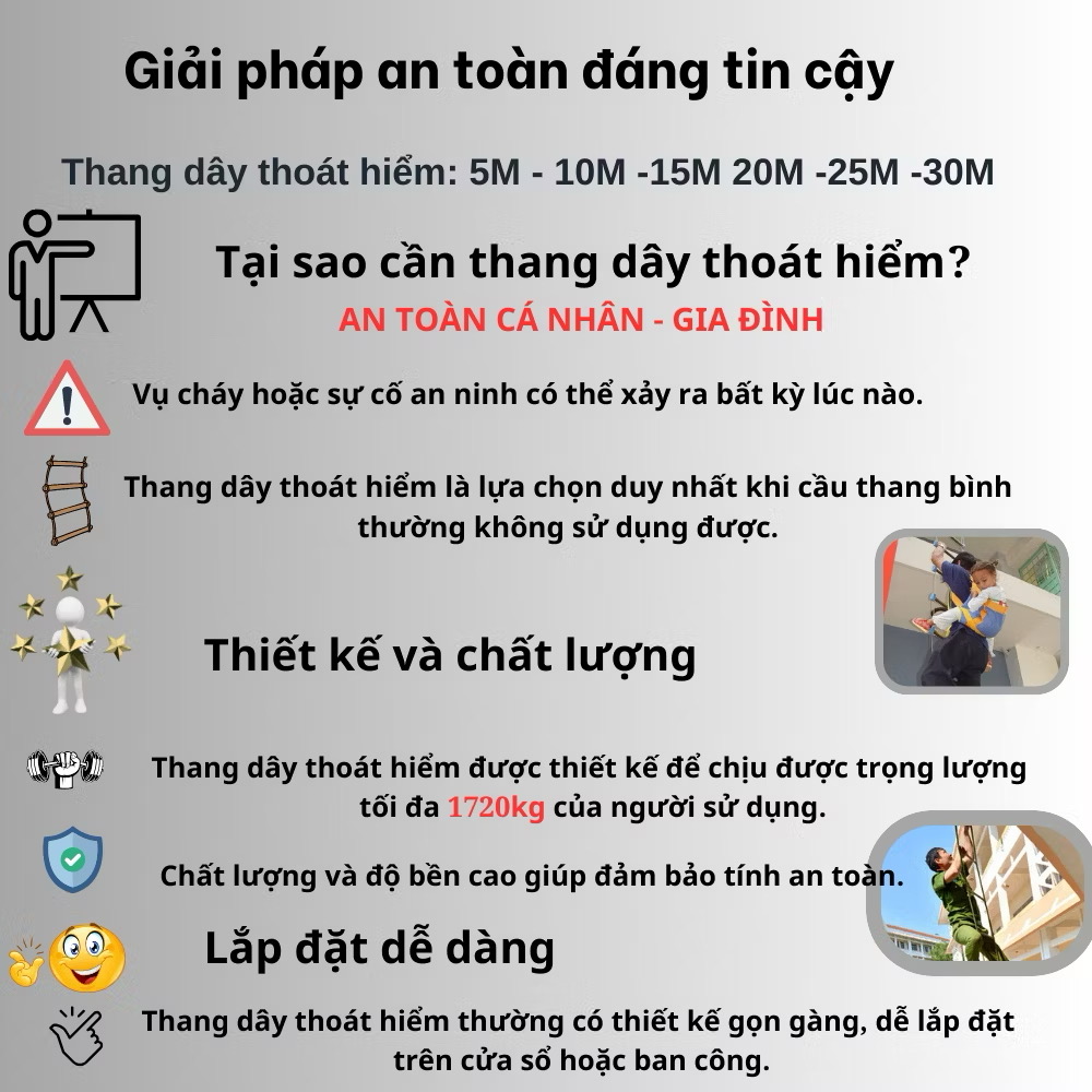 • An toàn tuyệt đối: Móc treo chịu lực lớn, đảm bảo an toàn cho người sử dụng khi thoát hiểm từ các tầng cao. - Thang dây thoát hiểm là một khoản đầu tư thiết thực cho sự an toàn của mỗi gia đình.